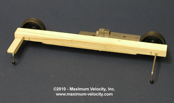 On my design, I discarded the other two wheels, and replaced them with outrigger bars, tipped with small beads. The weight is tungsten (just over 4 ounces) and the wheels are light weight H-Tread wheels. The alignment is set to rail ride. Admittedly the car could be made more elegant by hiding the weight and giving it a nice paint job, but I kind of liked the functional look.