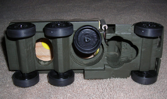 This year I decided to build a replica of the Deuce and a Half I once owned. It is a 1952 GMC M-211. I made the truck with two derby kits and a 2×4 for the cargo area. By hollowing out the underside of the truck I was able to get the weight down to 4.9 ounces, it is also regulation length measuring 7 inches. Two of the rear wheels were raised using the Pro-Body tool. The truck performed well in the parent-sibling race. It seemed to be a hit with the kids as well.